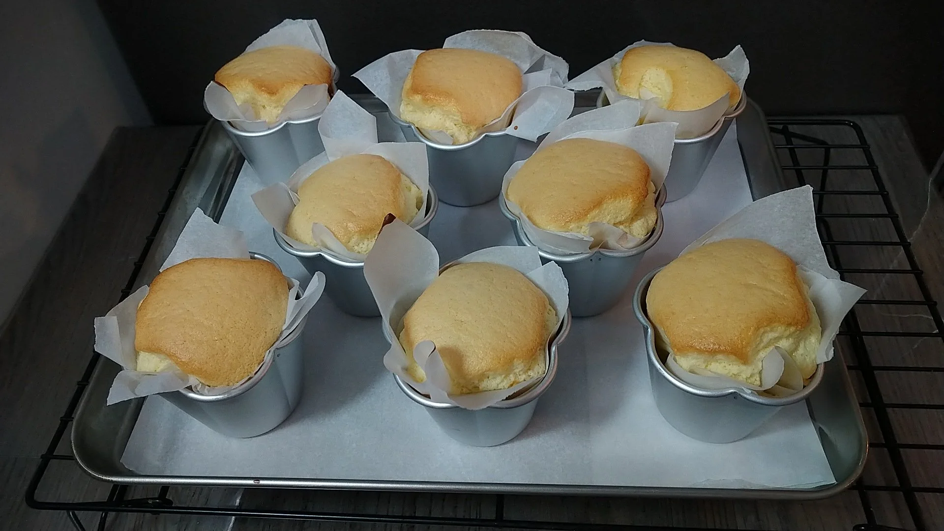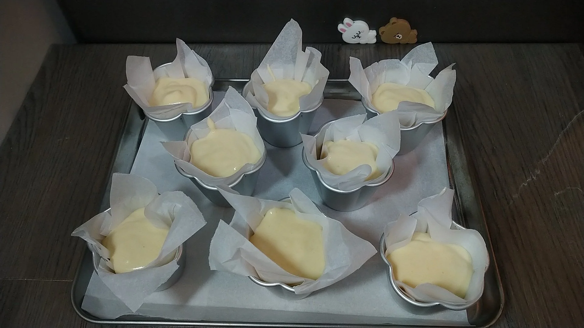 Let’s prepare our molds first. Cut out parchment paper in a square. Put a parchment paper on top of a mold. Use another mold to press the paper in. Repeat with all.