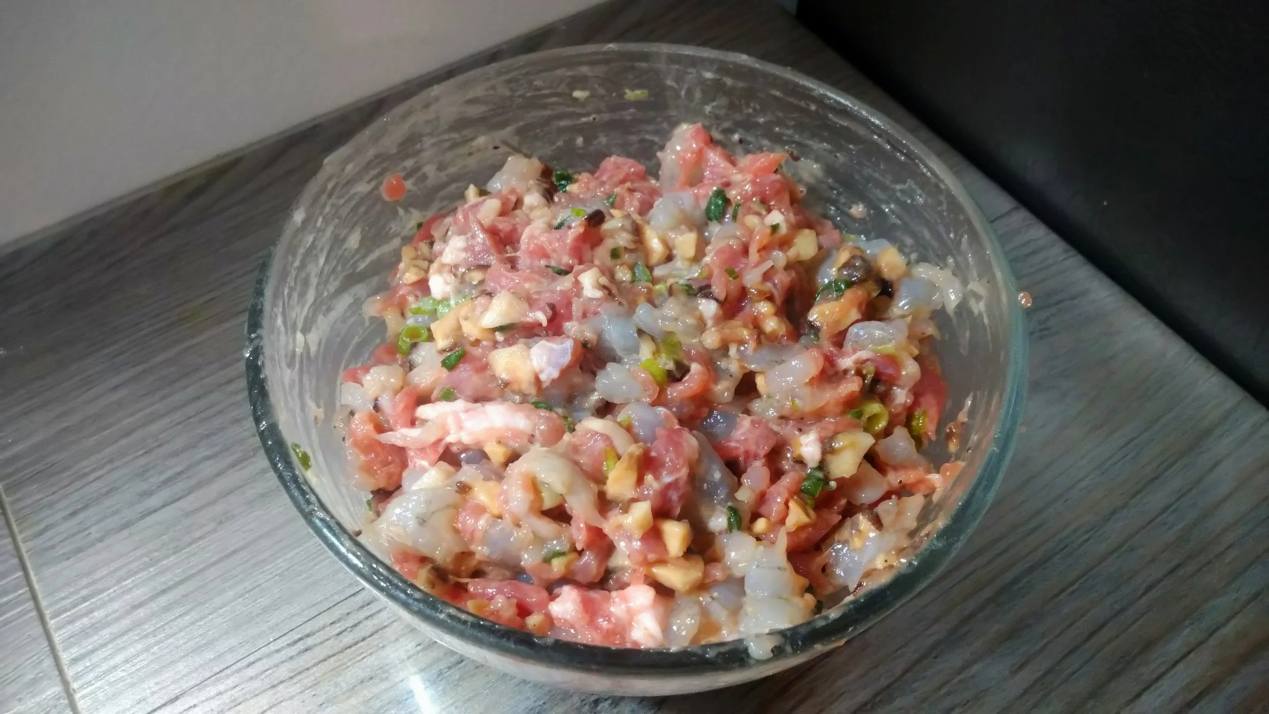 In a bowl add the pork and the marinade seasoning except the sesame oil. Massage seasoning in the meat until it becomes sticky. Add the shrimp, mushroom and spring onion. Mix until combined. Lastly add the sesame oil.