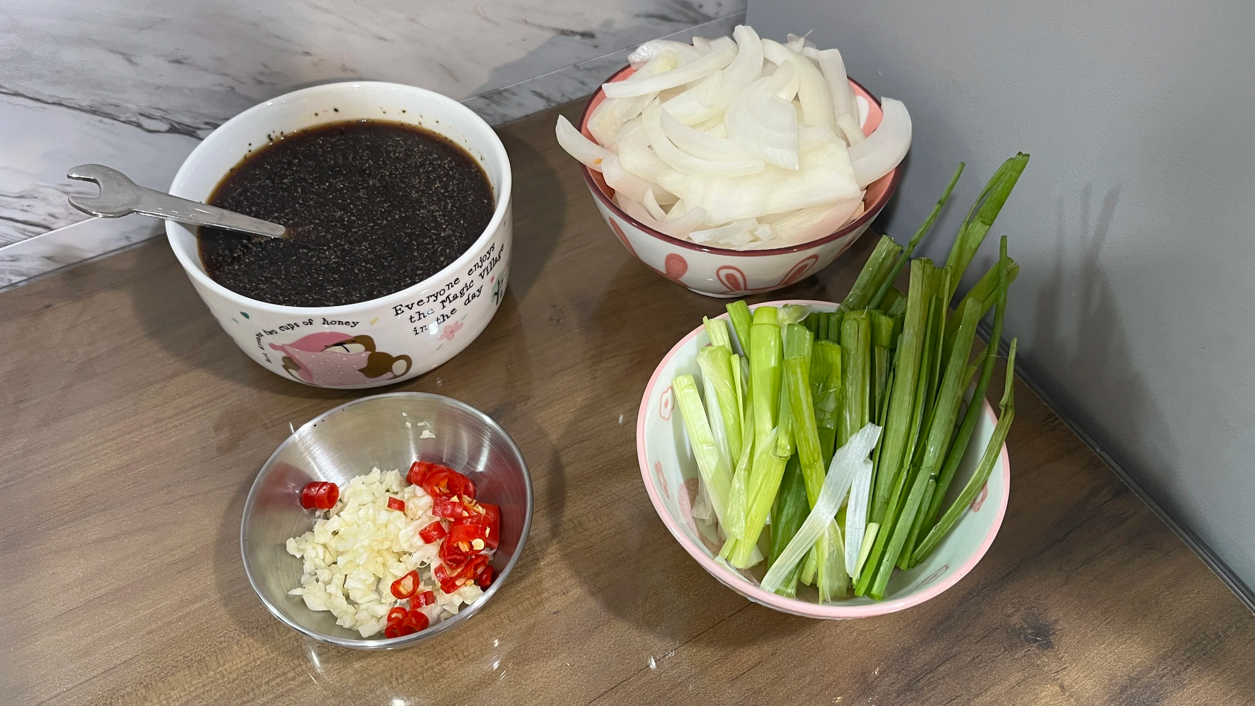 Mince the garlic. Slice the onion into thin strips. Cut the steak into thin strips against the grain for tenderness. Slice the spring onions, separating the white and green parts. Thinly slice the chili pepper if using.