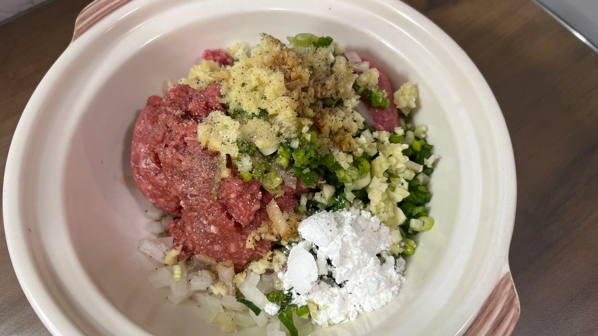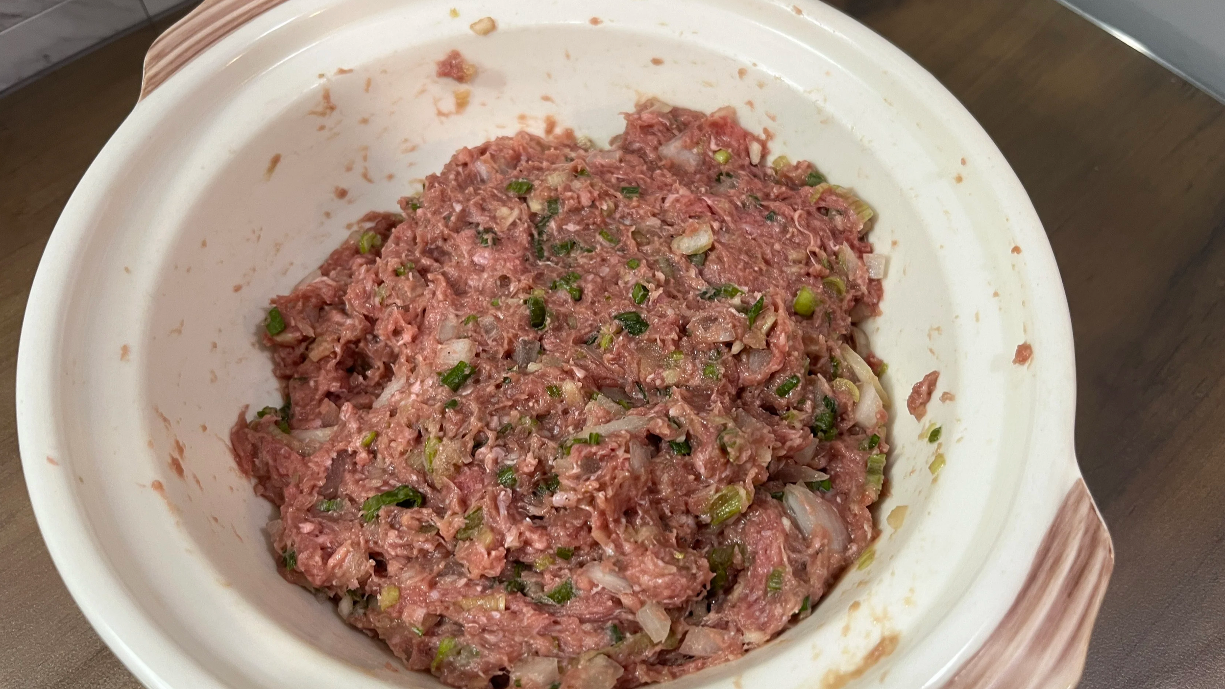 Add the onion, spring onion, ginger and garlic to the ground meat. Season to taste. Mix until combined.
