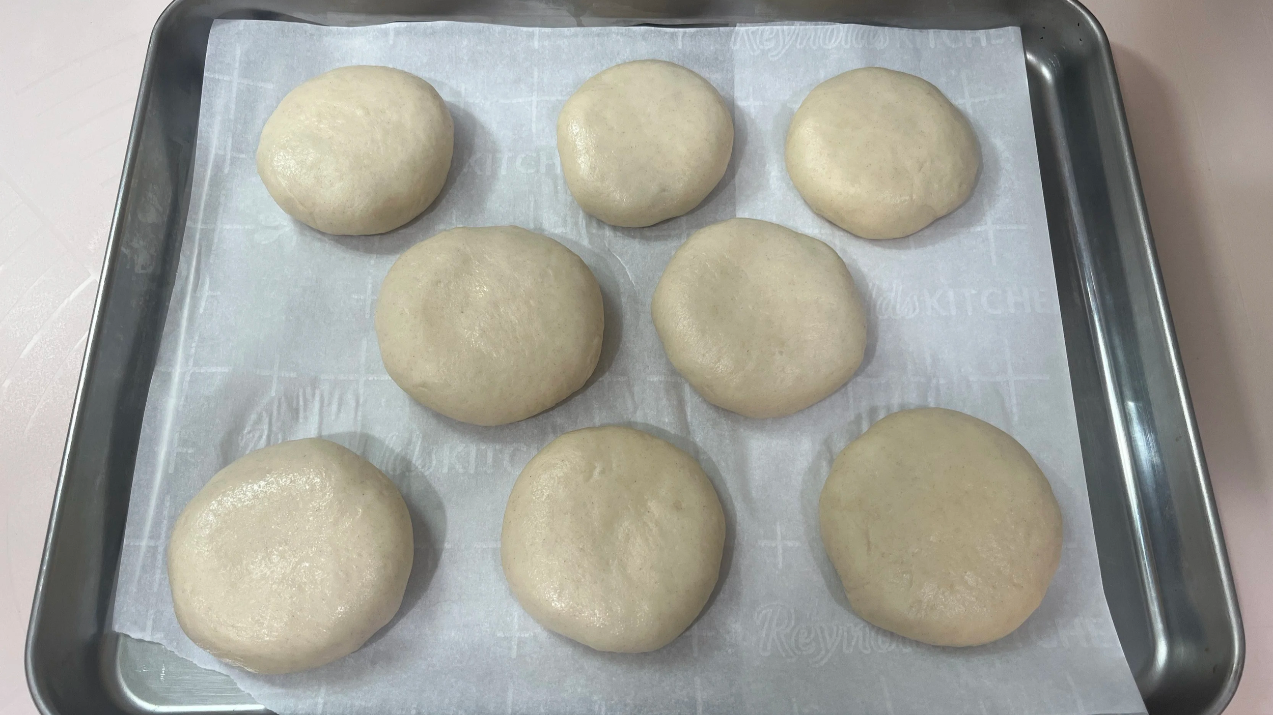 Letโs make the dough. Add flour into a bowl. Pour in the hot water. Mix with chopsticks. Add in batches 40-60 Milliliters Room Temp Water until a non sticky dough forms. Let the dough rest for 30 Min. Divide dough in 8 equal pieces. . Oil hands. Shape each dough into a ball.