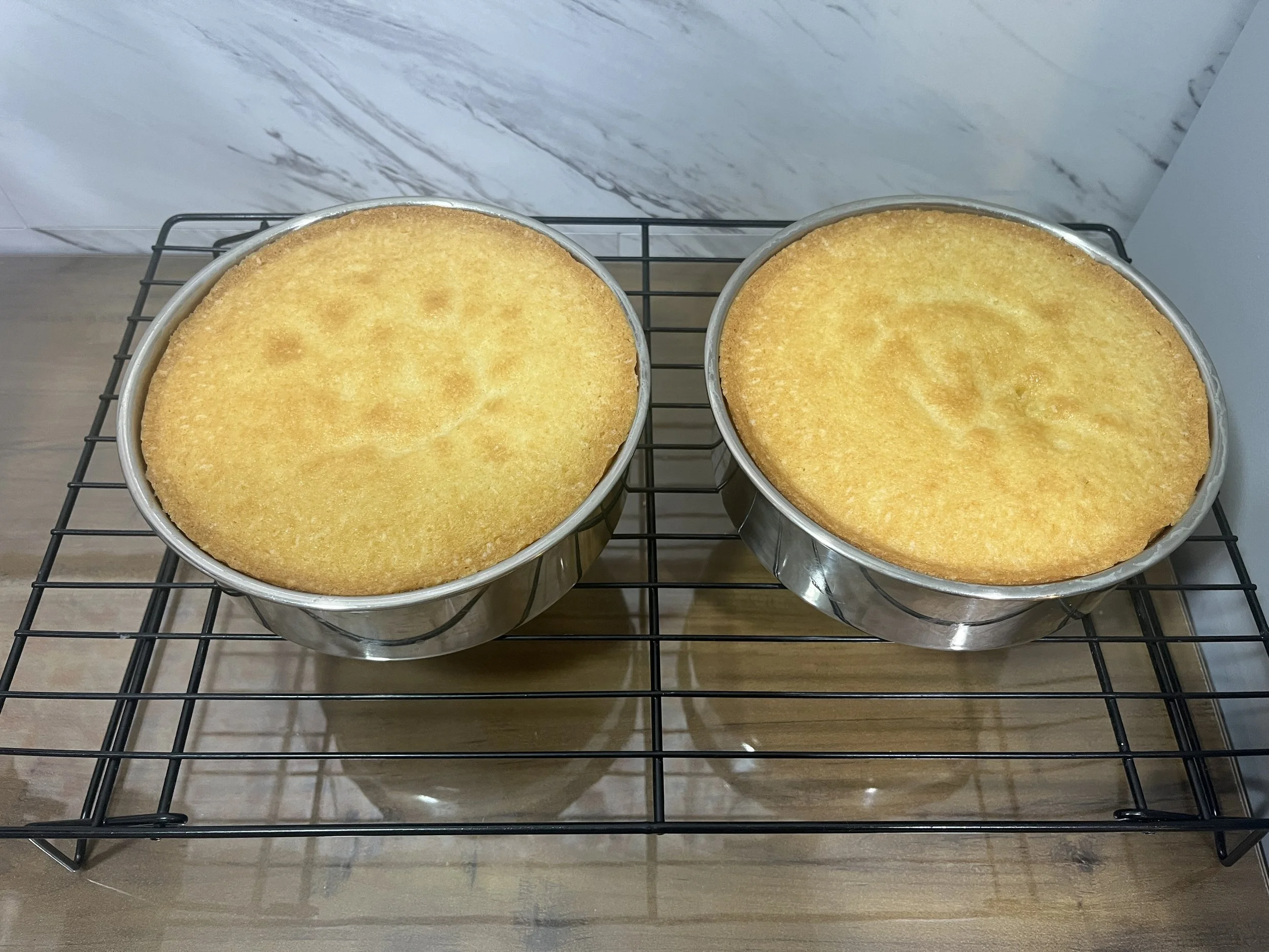 Add into greased baking molds. I am using 2 - 6 Inch molds. Flatten and tap to remove air bubbles. Bake 335F | 45 Min