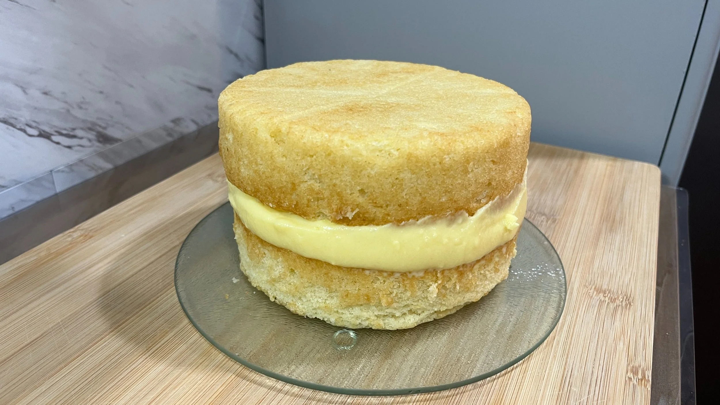 When cake is cool and pastry cream is cooled itโs time to assemble the cake. Cut off the top.
