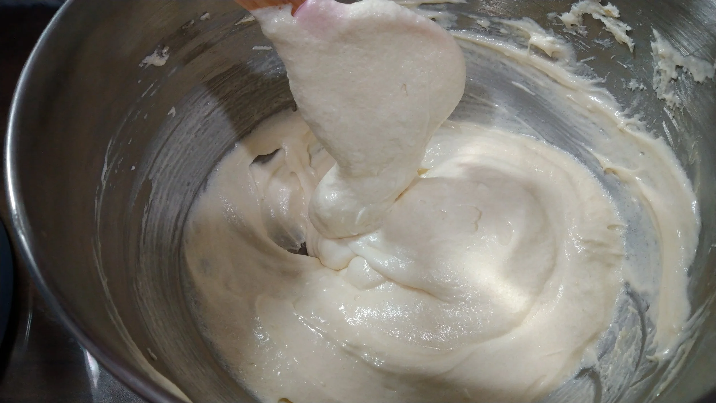 Scrape the sides. Turn it back on and add the milk/egg mixture. Mix until just combined.