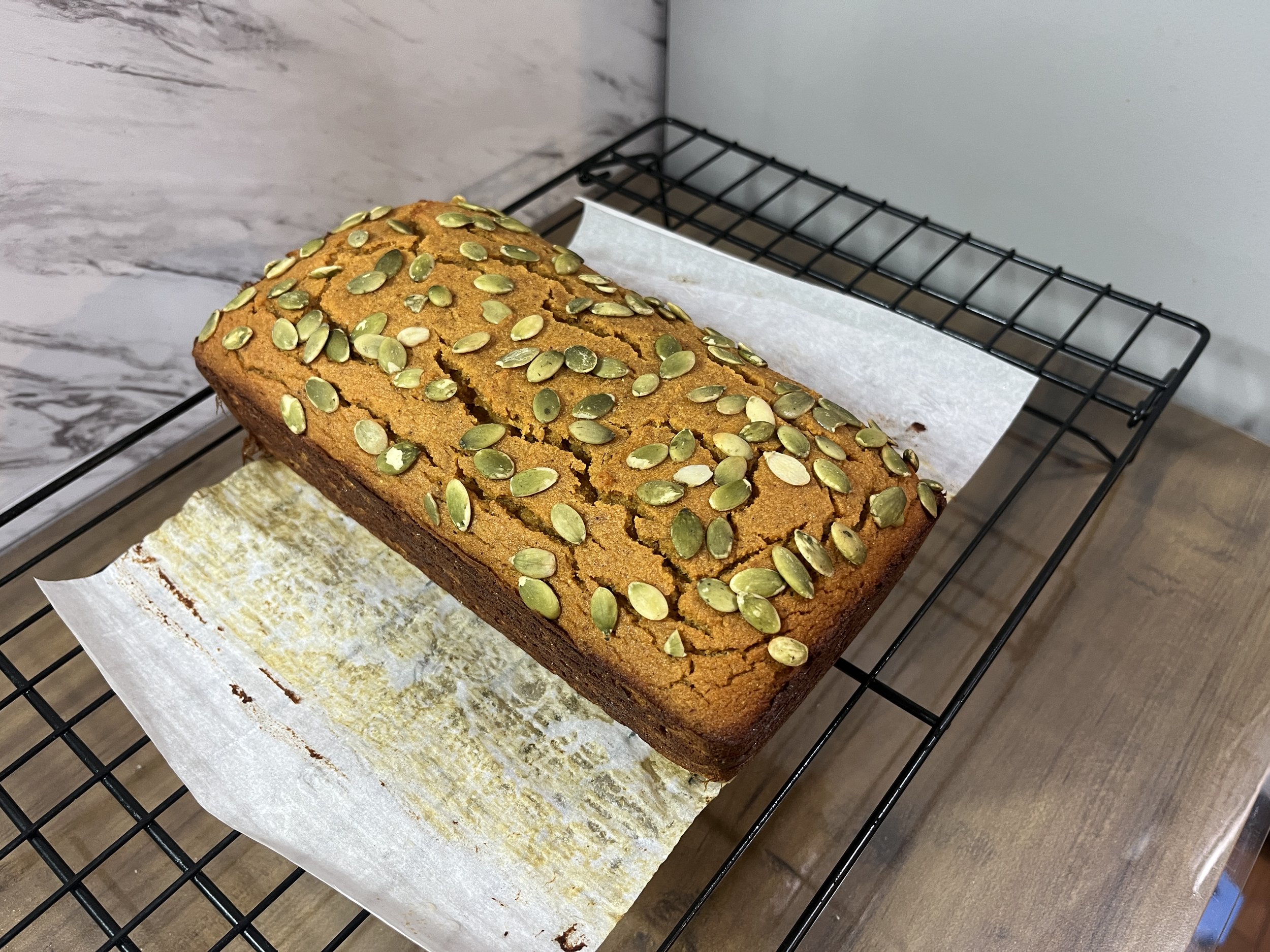 Transfer batter to a loaf pan lined with parchment paper. Spread the batter evenly into the prepared pan. Sprinkle chopped pumpkin seeds on top (optional).