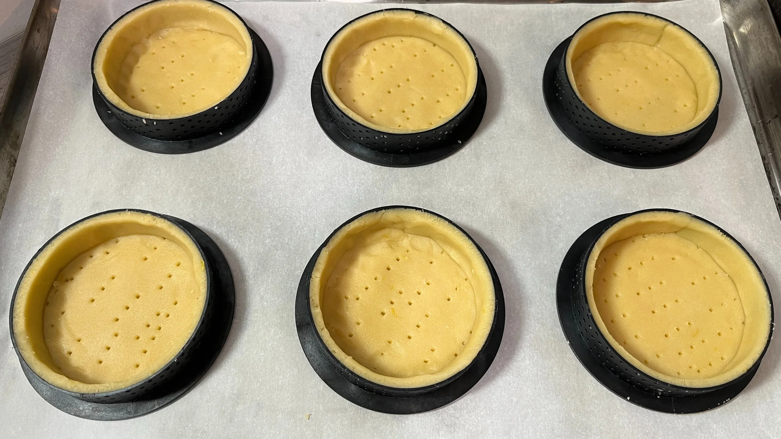 To make the tart shells and butter and sugar into a bowl. Beat until light and fluffy. Add the egg and beat again until incorporated. Add the dry ingredients and mix with a spatula to combine. Transfer to the working area and knead until a dough forms. Wrap with plastic film. Refrigerate for at least 1 hour