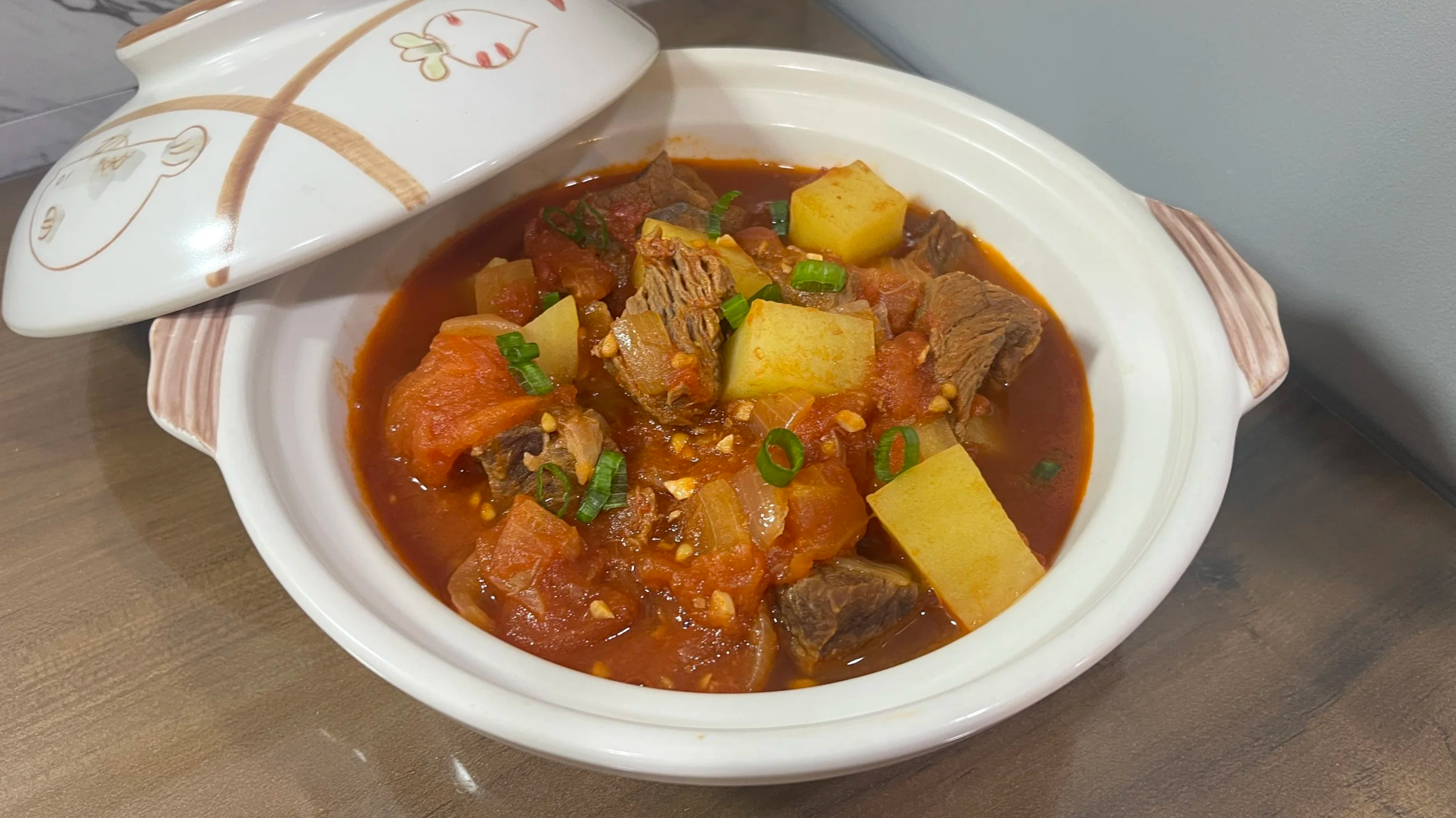 Comforting beef stew with melt-in-your-mouth beef, juicy tomatoes, and a savory, slightly tangy broth
