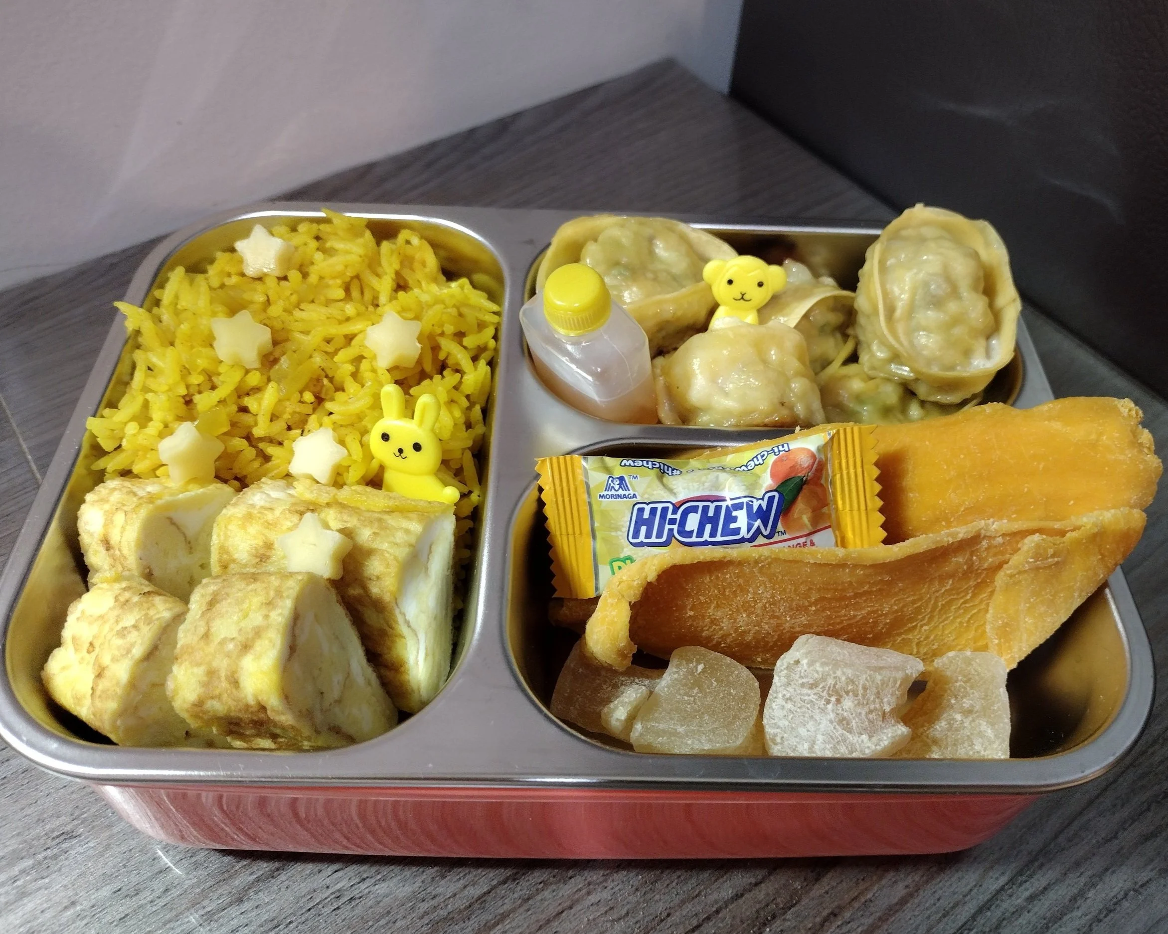 In our yellow bento we also got rolled omelette, dumplings, dried mango, dried ginger and Hi Chew.