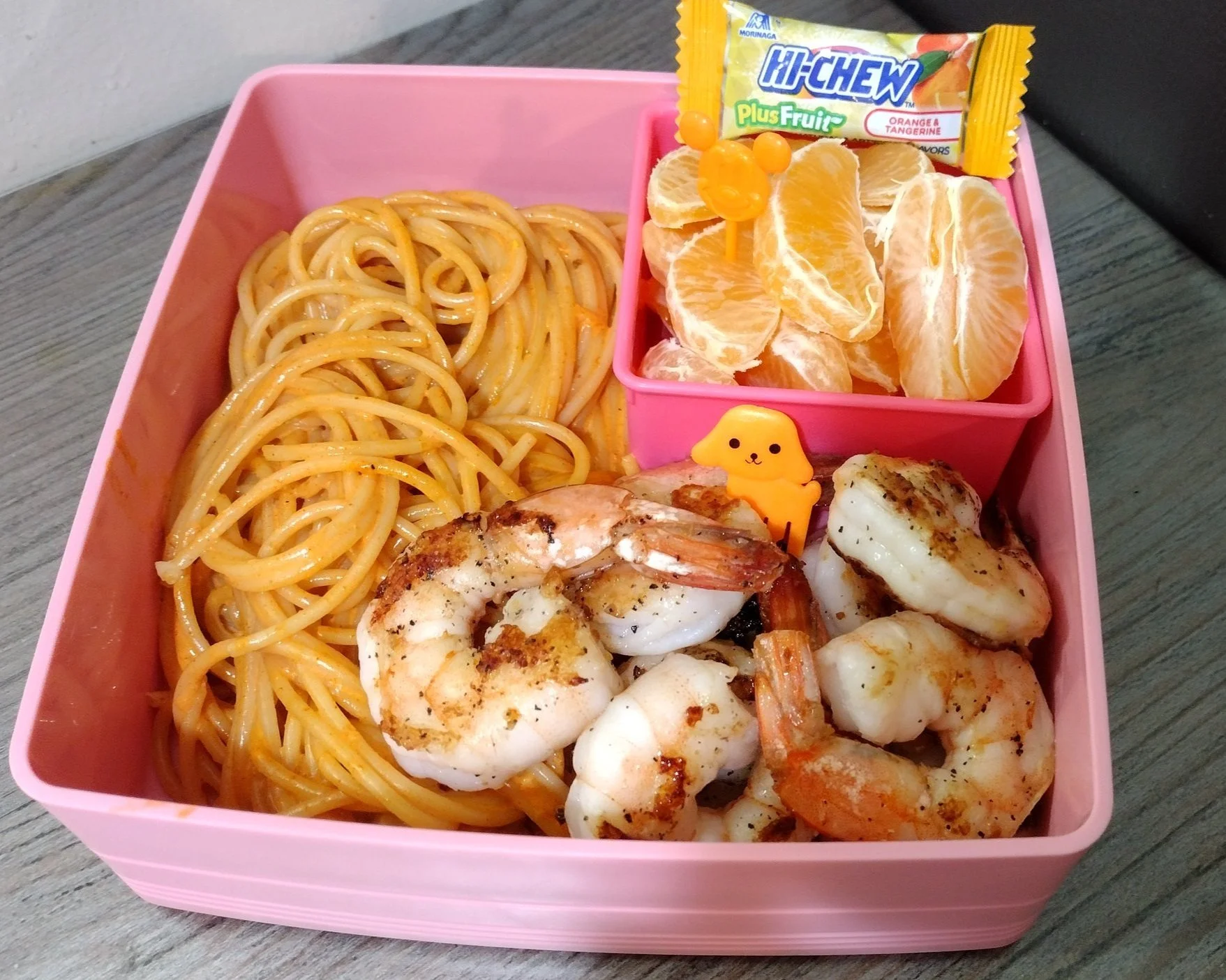In our orange bento we also got mandarins, shrimp and candy.
