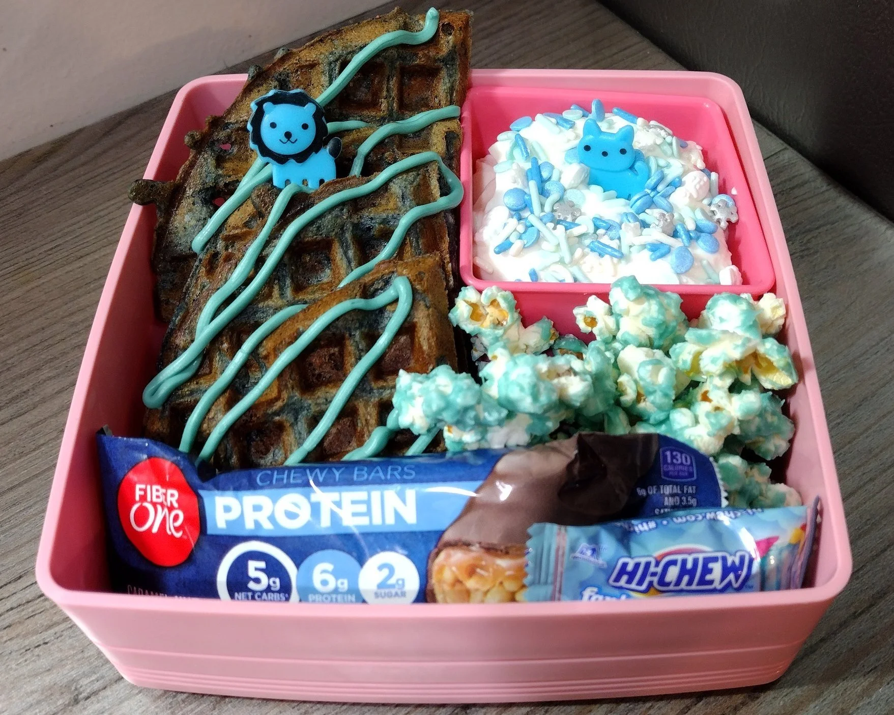 In our blue bento we also got yogurt with blue sprinkles, popcorn coated with blue candy melt, protein bar and Hi Chew.