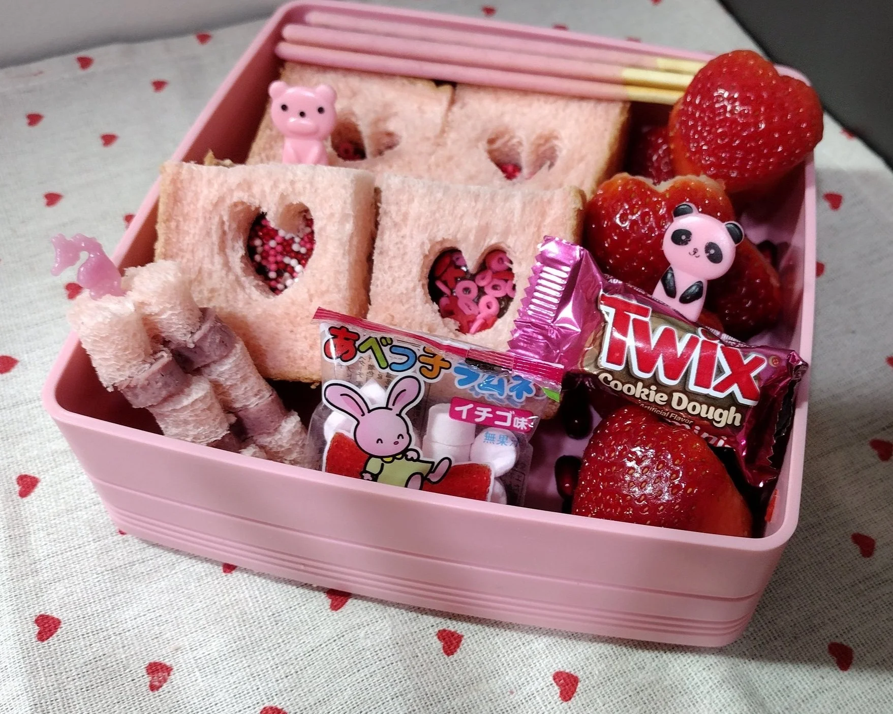 In our pink - red bento we also got sausage, strawberries, strawberry pocky and candies