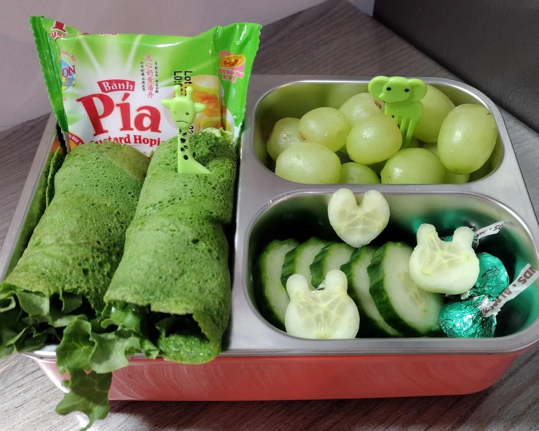 In our green bento we also got grapes, cucumbers, chocolate and pia pastry.